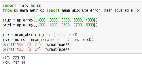 - 실제 값과 예측 값의 차이를 절대값으로 변환, 합산 후 평균을 구하는 방법입니다.